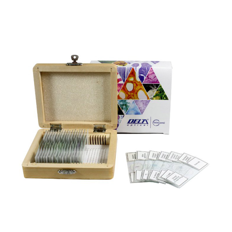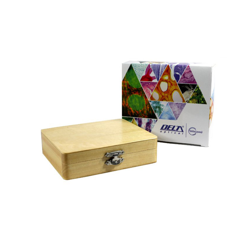 Набор микропрепаратов Delta Optical (25 шт.) для детального изучения под микроскопом в деревянном чемоданчике. Все препараты разные. Бактерии, грибы, одноклеточные, срезы растений и тканей животных, насекомые. Набор препаратов для изучения, включающий элементы растительного и животного происхождения.