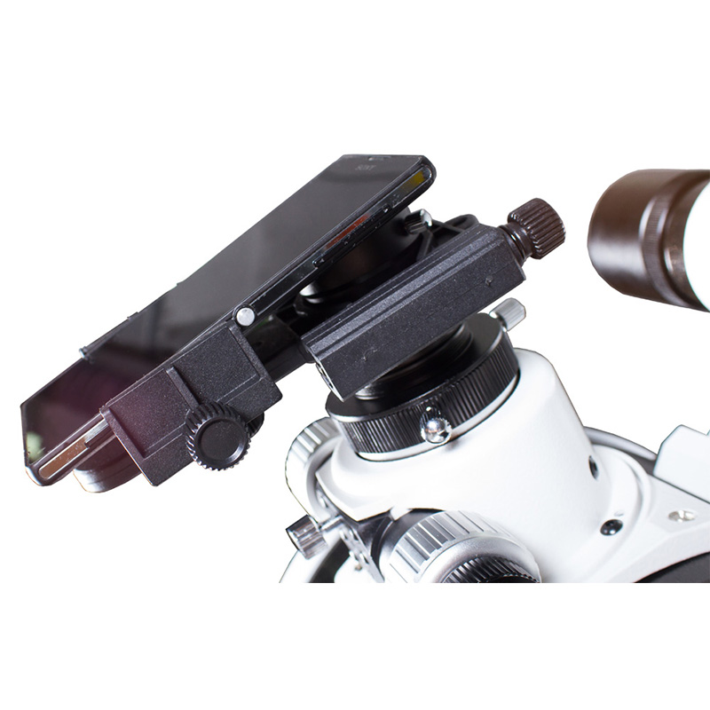 Специальным зажимом адаптер крепится к окуляру телескопа или микроскопа. Затем на специальную платформу аккуратно и надежно зажимается смартфон. Прорезиненное основание платформы исключает соскальзывание. Благодаря регулируемому зажиму, адаптер подходит ко всем моделям телефонов. Направив камеру смартфона на окуляр и отцентровав его, вы сможете делать интересные фотографии и делиться ими с друзьями в соц.сетях. Для настройки резкости изображения покрутите ручку фокусера телескопа или микроскопа.
