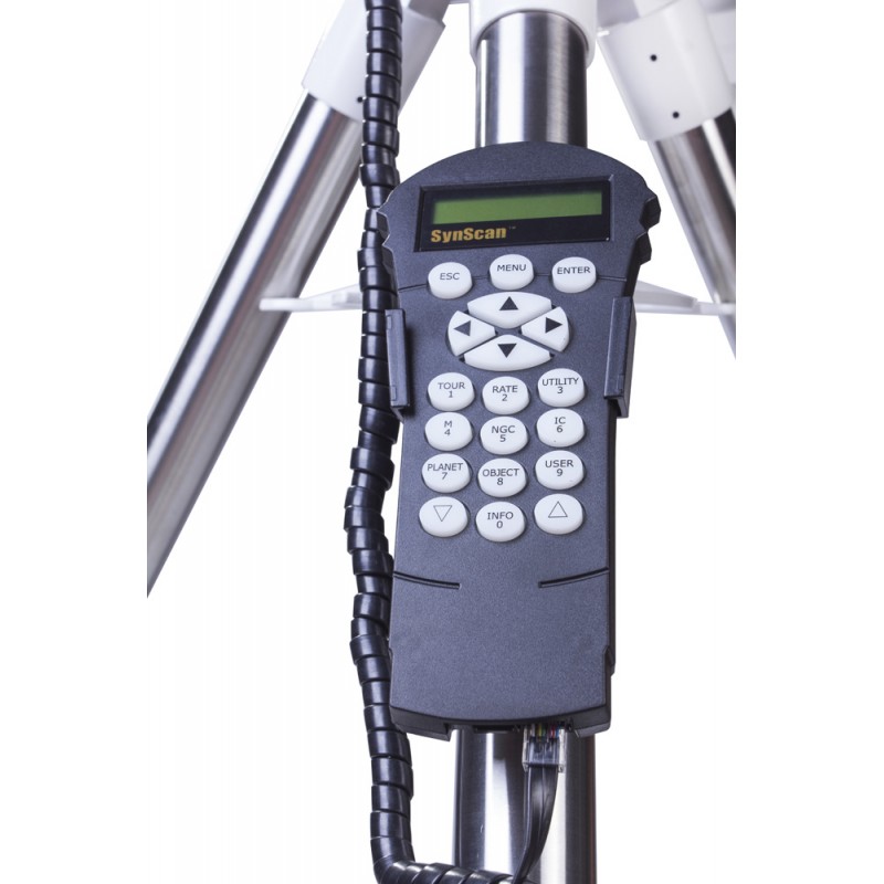 - Монтировка комплектуется версией пульта управления SynScan V4 с возможностью обновления прошивки и подключения GPS-модуля (GPS-модуль в комплект не входит). Встроенная база данных пульта содержит информацию о 42 000 небесных объектов и может обновляться через Интернет