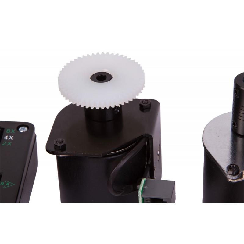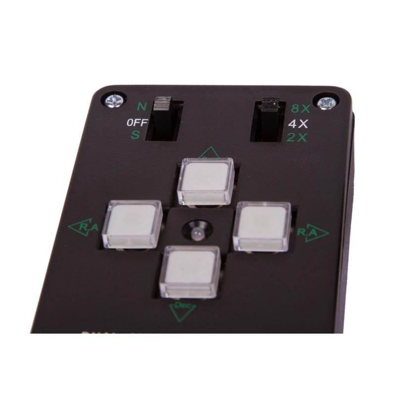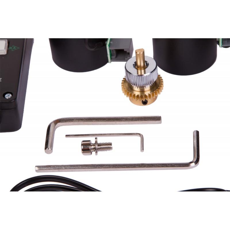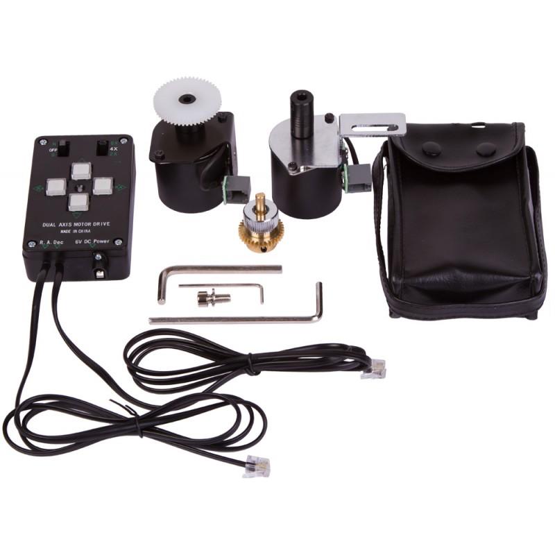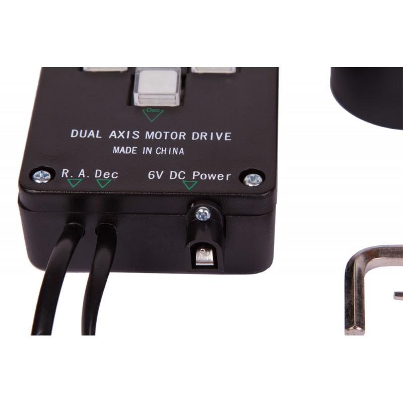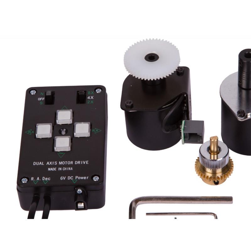 Приводы устанавливаются на ось прямого восхождения и ось склонения. Для управления используется удобный пульт, с помощью которого вы можете задать разные скорости движения: 2x, 4x, или 8x. Приводы работают от батареек (в комплект не входят).