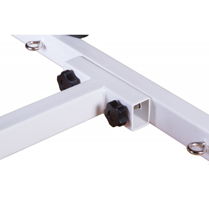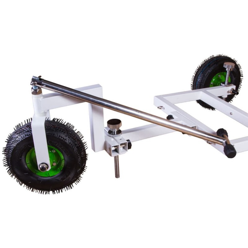 Тележка стальная и легко выдерживает немалый вес этих габаритных телескопов. Она имеет три колеса и три опоры. С помощью последних вы в любой момент можете зафиксировать тележку на горизонтальной поверхности, выдвинув их на нужную высоту. Передняя ручка складывается, поэтому сама тележка занимает меньше места при перевозке или дома.