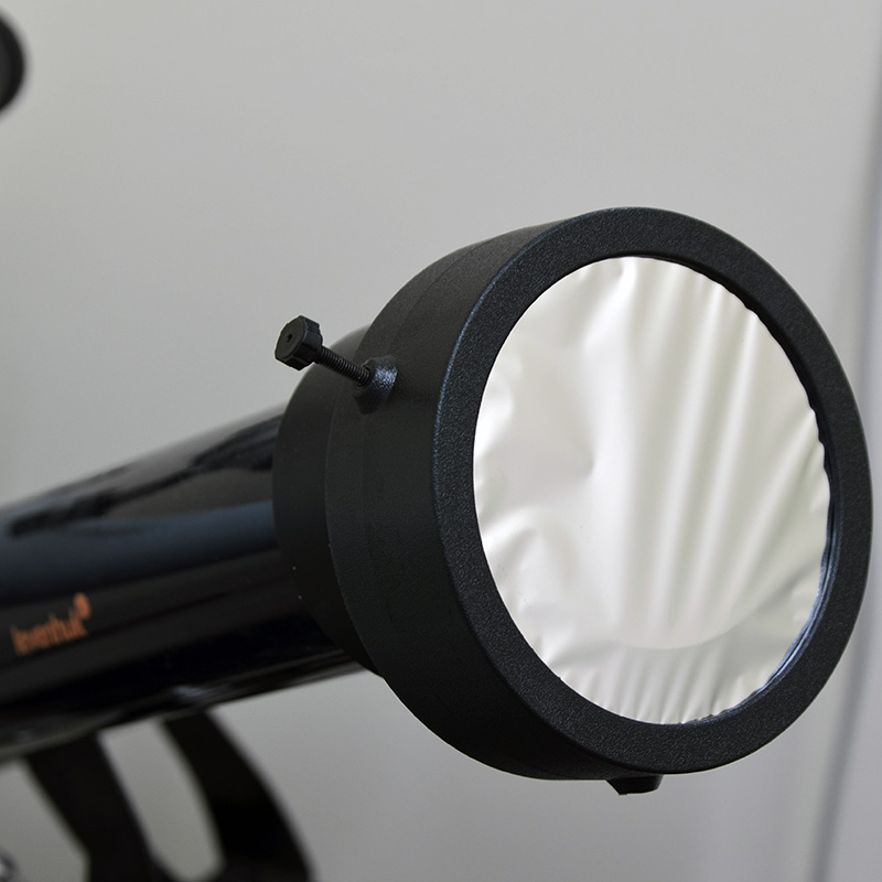 Универсальный солнечный фильтр подходит для всех телескопов от 60 до 90 мм. Он надежно закрепляется на трубе тремя винтиками.