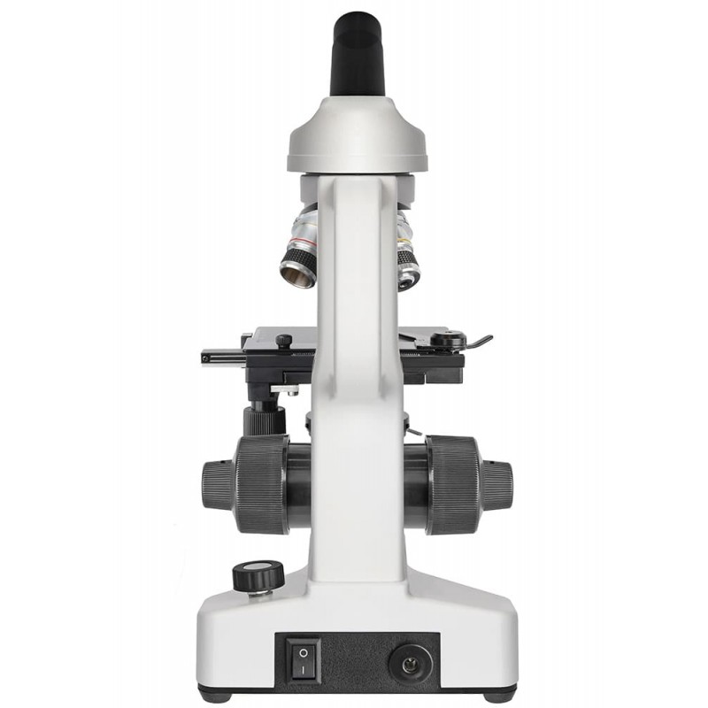 Оптическая схема микроскопа состоит из монокулярной насадки и револьверного устройства на 3 объектива. Насадка вращается на 360°, поэтому микроскоп удобно использовать при групповых наблюдениях. Револьверное устройство вращается легко, смена объектива позволяет быстро выбрать оптимальное для наблюдений увеличение. Прямо под объективами расположен предметный столик с препаратоводителем. Образцы для исследований необходимо размещать прямо на нем. Система освещения – это нижняя светодиодная подсветка и конденсор Аббе с ирисовой диафрагмой и держателем фильтра.