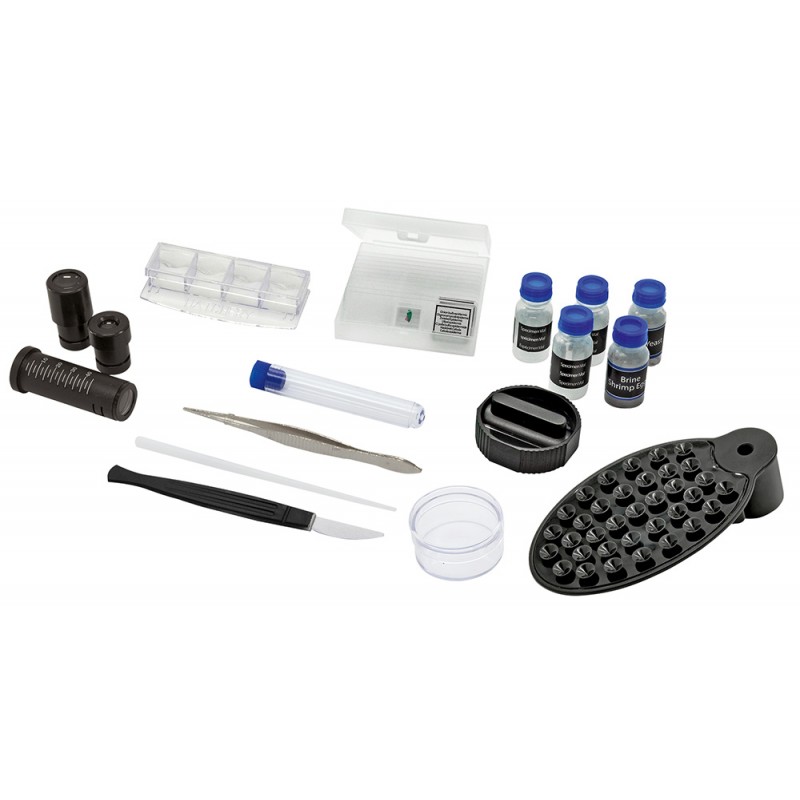Набор для опытов, включенный в комплект, предназначен для самостоятельного разведения артемии (морского рачка), создания микропрепаратов и проведения научных экспериментов. Еще один аксессуар – адаптер для смартфона. Он предназначен для крепления на микроскопе смартфона таким образом, чтобы камера мобильного устройства могла запечатлеть изображение в окуляре. Благодаря этому можно получать захватывающие снимки микромира без приобретения дорогостоящей цифровой камеры.