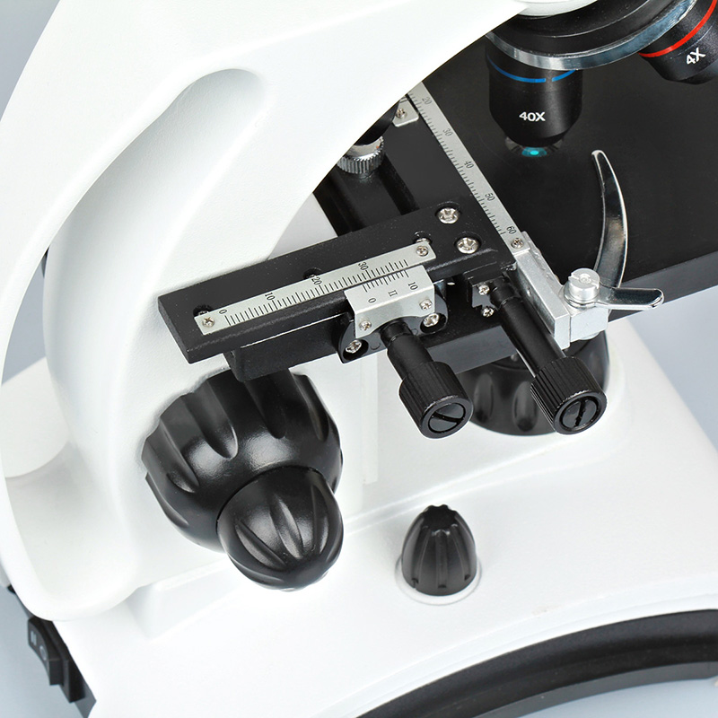 - На предметном столике есть микроподвижки с координатными шкалами по двум осям. Это позволяет рассматривать препараты любого размера, измерять расстояние или скорость движения объектов наблюдения.