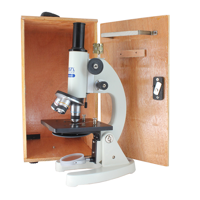 Микроскоп поставляется в винтажном деревянном кейсе с ручкой и запирается на замок ключем.