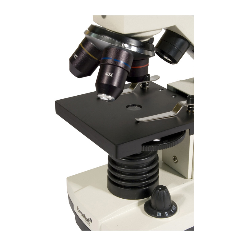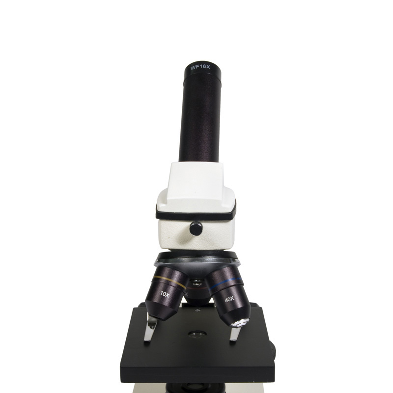 Кратность увеличения напрямую зависит от использующихся окуляра и объектива. Окуляр расположен на уровне глаз и обеспечивает возможность рассмотрения объекта, а объектив нужен для получения чёткой картинки. В базовую комплектацию микроскопа включён окуляр модели WF16x и 3 объектива с 4-х, 10-ти и 40-кратным увеличением.