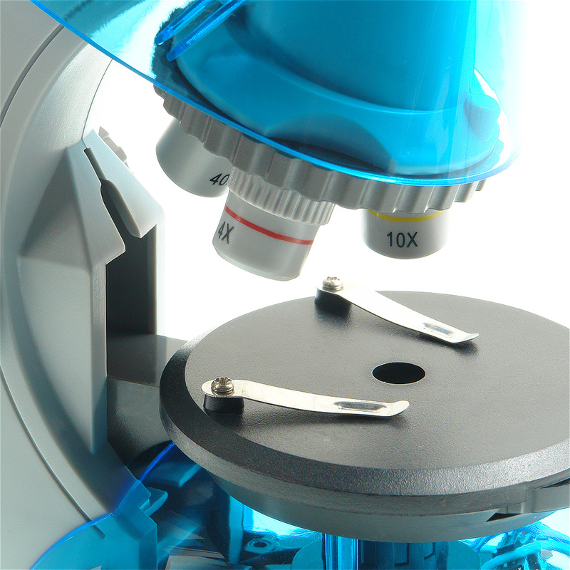 - Три объектива на револьверном устройстве (4-10-40х) — позволяют менять увеличение на ходу, как в настоящих лабораторных микроскопах