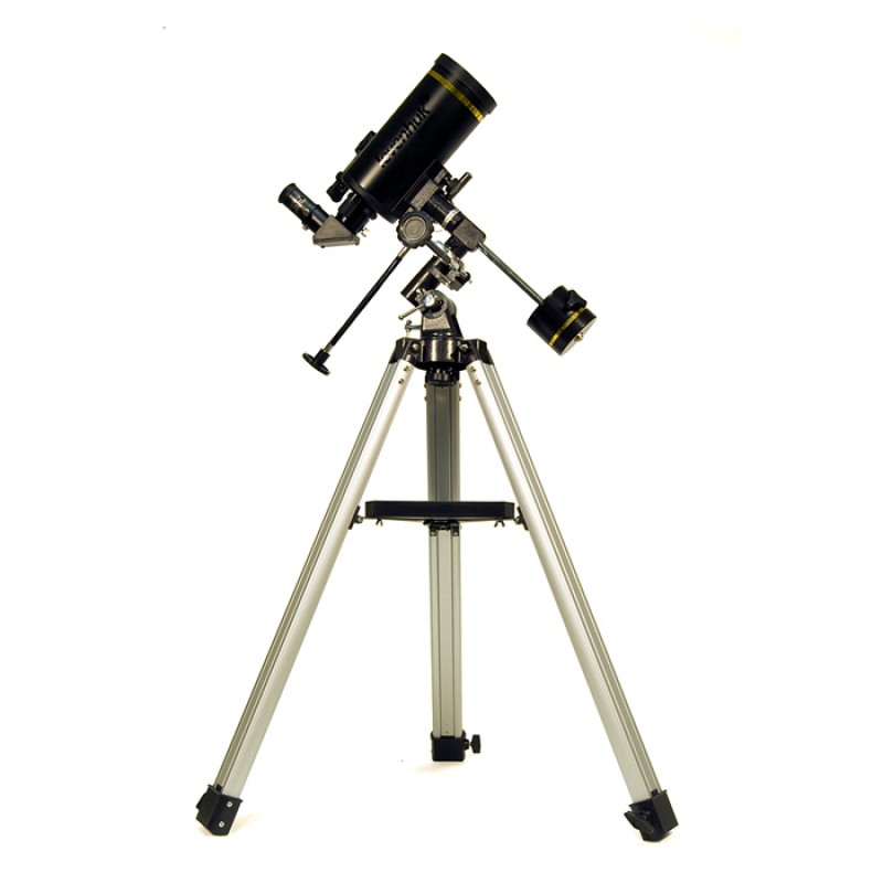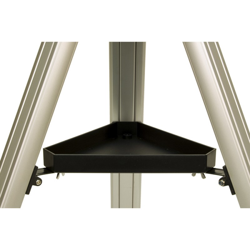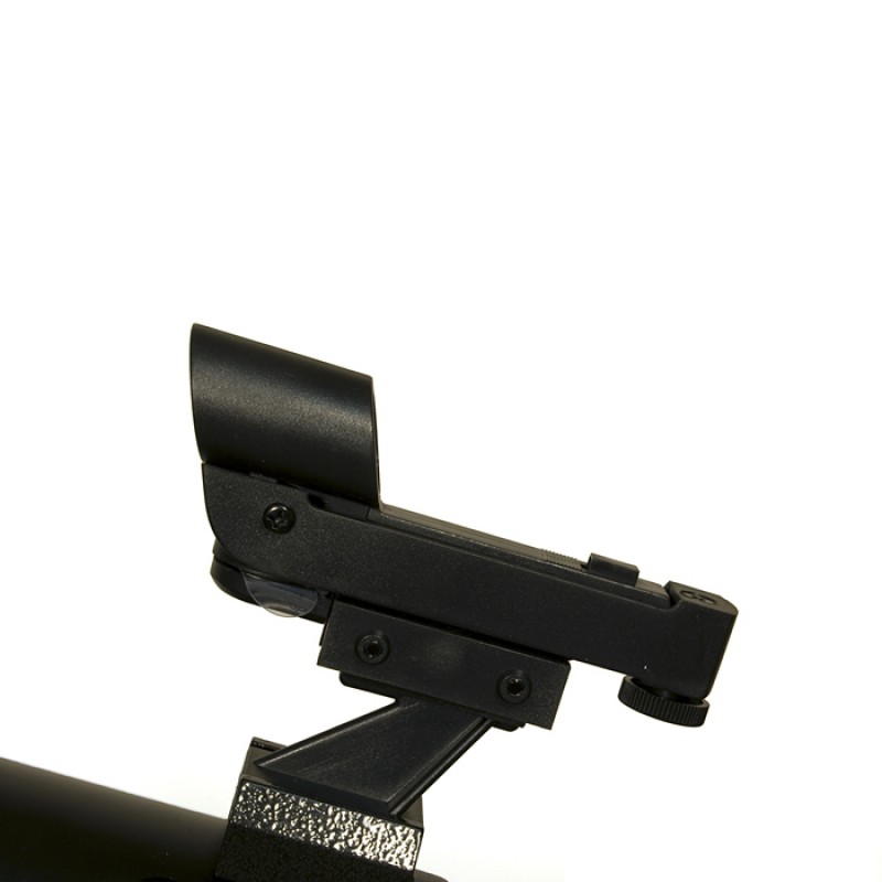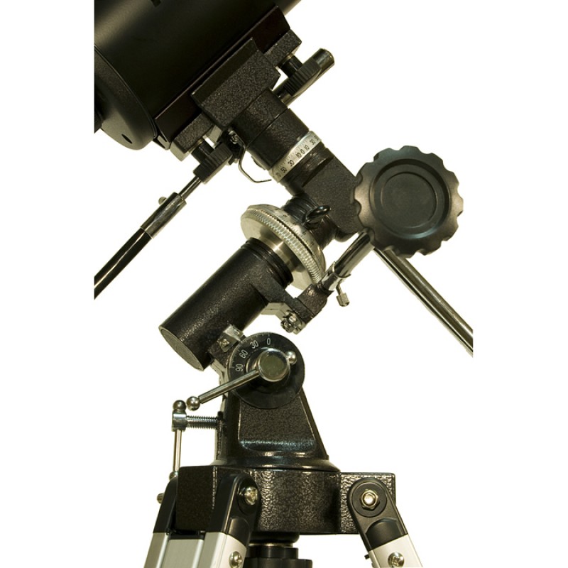 Линзовые поверхности телескопа имеют просветляющее покрытие, которое обеспечивает максимальное светопропускание, а отражающие – защитный слой, увеличивающий срок их службы. Очень компактная и легкая алюминиевая труба установлена на экваториальную монтировку, оснащенную ручками точных движений и допускающую установку электропривода часовой оси (приобретается отдельно). Такая монтировка имеет специальные координатные круги, с помощью которых, после несложной настройки, можно находить объекты по их экваториальным небесным координатам, а также сопровождать суточное движение объекта вращением только одной ручки. Тренога регулируется по высоте и имеет удобную полочку для принадлежностей, а коллиматорный искатель с красной точкой позволит быстро навести телескоп на нужный участок неба.