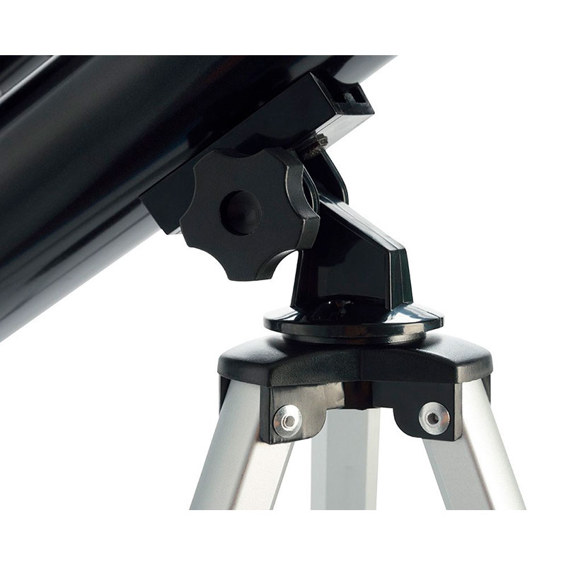 Оптическая труба оснащается компактным искателем с фиксированным пятикратным приближением и входной апертурой 24 миллиметра. Он позволяет быстро позиционировать тубус на выбранном участке неба и эффективно проводить дальнейший обзор объектов. Телескоп управляется простой азимутальной монтировкой с двумя степенями свободы, надежно удерживается на ровных горизонтальных поверхностях алюминиевой треногой.