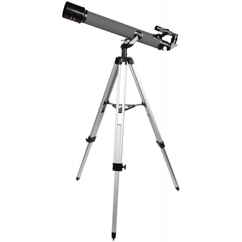 Телескоп собран по схеме ахроматического рефрактора, причем все линзы стеклянные. На внешние поверхности нанесено антибликовое покрытие, что улучшает качество картинки по всему полю зрения. Монтировка вилочная, азимутальной ориентации. На вертикальной оси находится микровинт, с помощью которого можно проводить более точную наводку оптической трубы. Тренога алюминиевая, с полочкой для аксессуаров. Высоту ножек треноги можно регулировать.