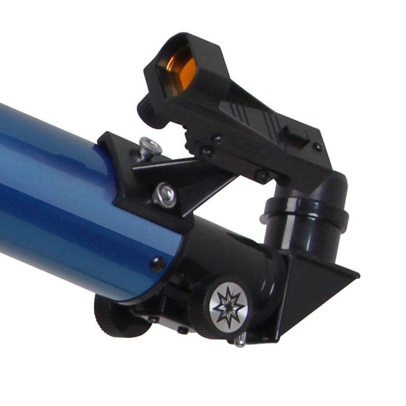Телескоп укомплектован азимутальной монтировкой на устойчивой треноге с возможностью регулировки высоты ног - вы можете настроить его под свой рост: наблюдать будет удобно, и взрослому и ребенку. Азимутальная монтировка очень проста в сборке и установке. Микрометрический винт, обеспечивают плавное ведение телескопа по высоте. Для быстрого поиска объектов на трубе телескопа установлен современный коллиматорный искатель c красной точкой - Red Dot. Обычно, такими искателями комплектуются только продвинутые телескопы стоимость от 1000$, но компания MEADE устанавливает Red Dot в том числе и на любительские модели.