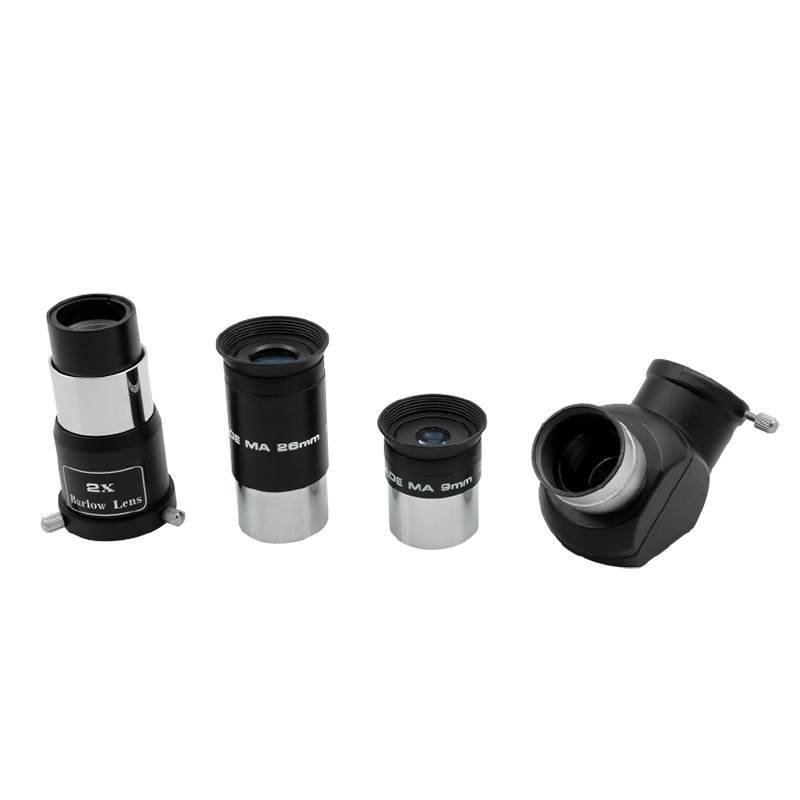 Телескоп MEADE Infinity 70 mm комплектуется двумя окулярами 9 мм (78Х) и 25 мм (28Х), а также 2 кратной линзой Барлоу, которая увеличивает фокусное расстояние ровно в два раза. Тем самым у пользователя получается уже не два, а четыре увеличения: 78х и 156х, 28х и 56х. Диагональная 90 градусная призма, обеспечивает максимальный комфорт при наблюдении наземных объектов.