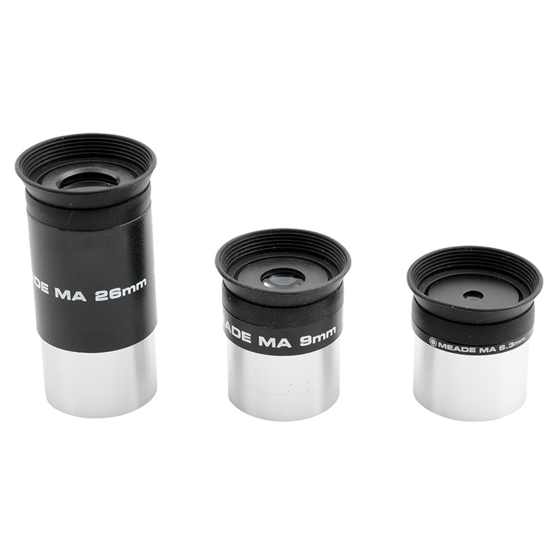 В отличие от других брендов, которые комплектуют телескоп всего двумя окулярами, в комплект MEADE Polaris входят три окуляра: 6,3 (143Х) мм, 9 (100Х) мм и 25 (36Х) мм. Плюс линза Барлоу 2х, которая удваивает увеличение. Таким образом, вместо 4 вариантов увеличений в других моделях, с Meade Polaris 114 mm даже в базовом комплекте вы сможете перемещаться аж по 6 вариантам увеличений и находить для каждого объекта наиболее оптимальное.