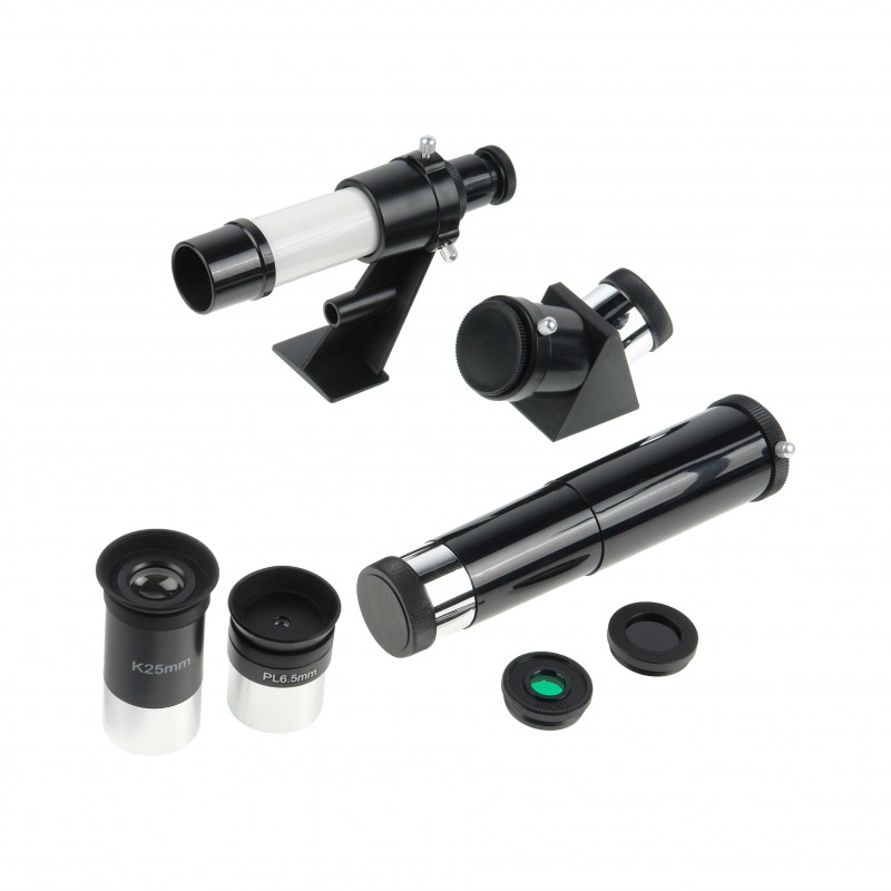 Принадлежности для работы с телескопом не нужно подбирать, всё необходимое есть в комплекте. В первую очередь это окуляры Pl6,5 и К25 с мягкими наглазниками, защищающими от боковой засветки. Если наблюдатель носит очки, то для более комфортной работы он может загнуть наглазник, чтобы уменьшить расстояние между окуляром и зрачком. Обязательно пригодятся и линза Барлоу 3х, повышающая кратность окуляров в 3 раза, и фильтры – солнечный, снижающий интенсивность света до безопасных значений, и лунный, увеличивающий контраст.